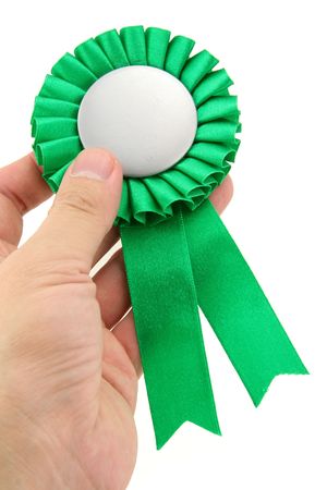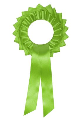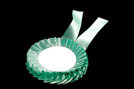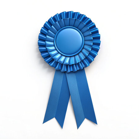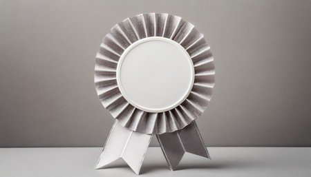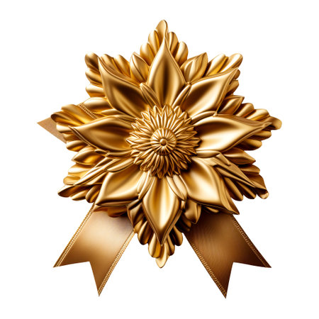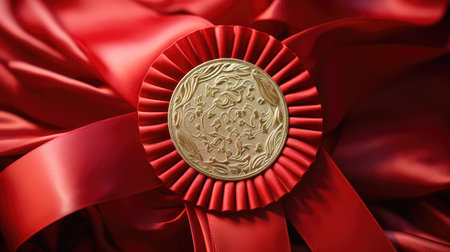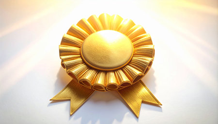 A golden ribbon rosette award with a blank center and bright lighting. Clear details and vibrant colors enhan...