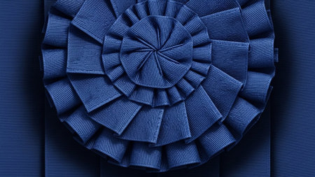 A vibrant blue rosette ribbon is shown from a top-down view, featuring detailed layered fabric petals and a central circular with rich texture.