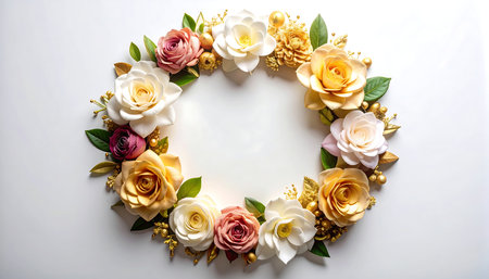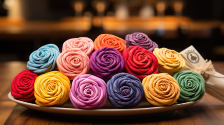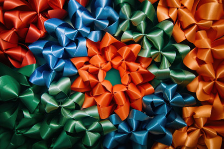 Vibrantly colored ribbons and bows create a spiral design around a central space, perfect for displaying text or branding elements prominently.