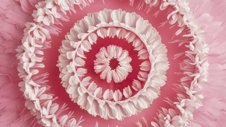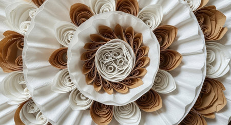 Concentric floral paper art with white and brown rolled layers and pleated outer ring