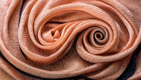 a soft delicate peach fabric swirls around inviting the viewer to get lost in its intricate texture and calming hue