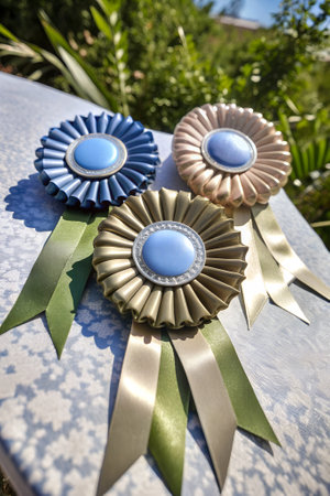 rosettes for horse competitions neatly arranged on a wooden panel, created with generative ai