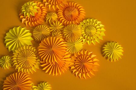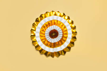 Festive white and gold paper fans for party, birthday, holiday, wedding on beige background top view copy space. origami. decorative objects. Colorful abstract background. Festive trendy backdrop.