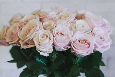 Bouquet of pink roses. Beautiful, bright floral background. top view.