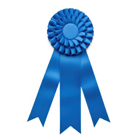 A detailed blue rosette ribbon award with flowing tails, presented against a stark black backdrop, symbolizing achievement and recognition.