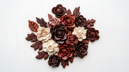 A stunning arrangement of a Valentine chocolate bouquet, with milk and dark chocolates shaped as flowers, placed on a clean white surface with a romantic feel