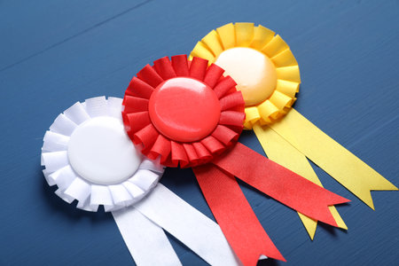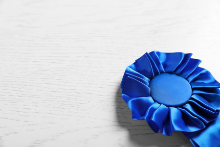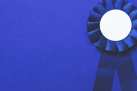 Champion or Winners 1st Place blue rosette with gold text placed in the center on a light blue background with copy space