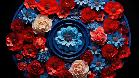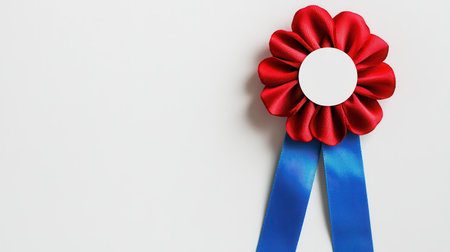 A vibrant ribbon award featuring a red flower design and blue tails stands against a white backdrop. The center is blank, allowing for personalization for achievements or events