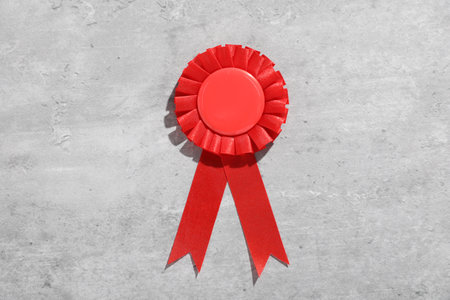 Close-up of a lustrous red metallic award ribbon with a serrated edge, presented on a dark, textured surface. Top-down view.