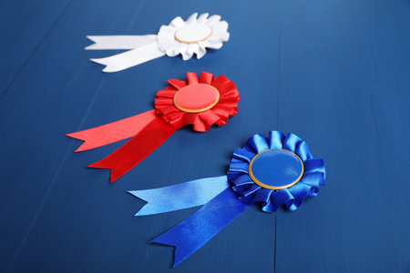 A vibrant blue award ribbon features a blank center, perfect for personalizing with names or titles. The soft background enhances its festive appearance.