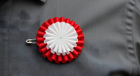 A close-up of a red and white ribbon rosette or cockade, pinned with a safety pin to a gray button-up shirt. The circular, pleated ribbon is a national symbol, possibly for Indonesia or Poland, worn during patriotic celebrations.