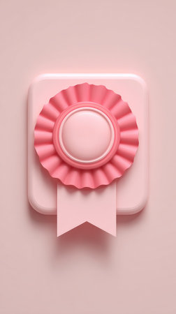 A pink award ribbon on a square background, symbolizing achievement and recognition.
