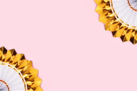 Frame made of golden paper fans on a pink background. Festive composition with copyspace.