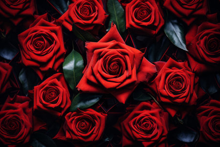 A close up of a bunch of red roses. The roses are arranged in a way that they are all facing the same direction, creating a sense of unity and harmony