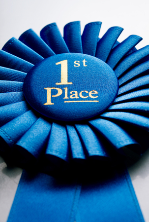 Blue first place winner rosette or badge from pleated ribbon with central text to be awarded to the winner of a competition on a graduated grey background with copyspace