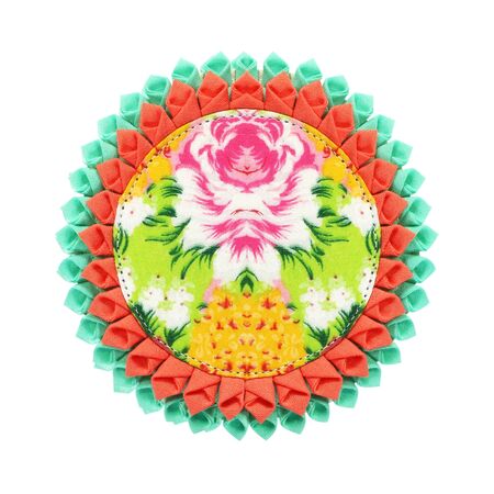 A decorative art piece displays vibrant circular and spiral patterns made from layered materials, captivating viewers with its intricate designs.