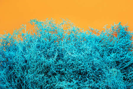 Abstract sea wave colored decorating plant bush on orange wall background. Summer abstract background.