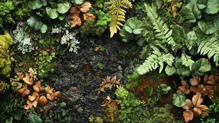 A detailed view of the forest floor, capturing the rich diversity of plants, ferns, and moss, highlighting the intricate natural beauty of the ecosystem.