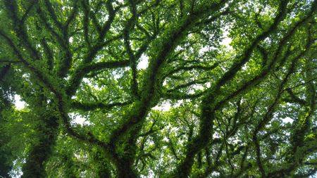 Tree in the forest with green leaves, bottom view