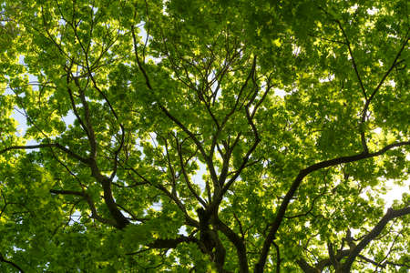 The sky shines through the crown of a tree with young spring leaves. View from below on the sprawling branches of a forest tree