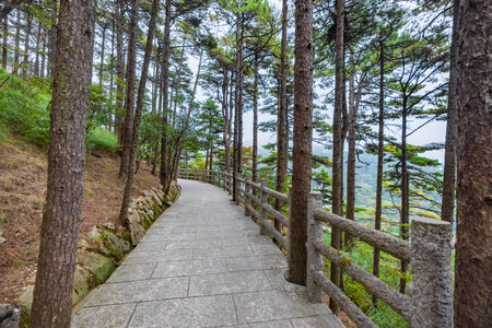 Wooden walking path across among trees on Wugong Mountain in Jiangxi, China
