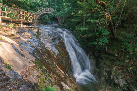 Scenic view of bridge over river among beautiful green woods in the Zhangjiajie National Forest Park, Hunan Province, China. Amazing summer landscape.
