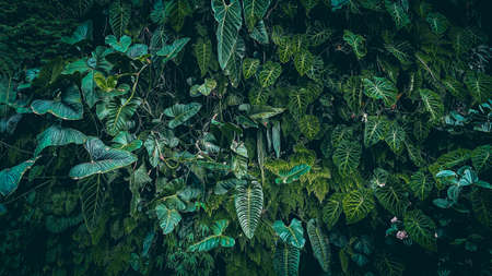 Tropical forest with green leaves. Dark tone. Selective focus.