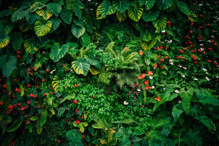 Lush Tropical Foliage Background. Green Plants Wall Design With Anthurium Leaves And Ferns