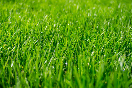 Fresh green grass with drops of dew as a background image. Top view. Copy, empty space for text.