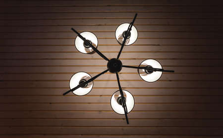 Chandelier on a light wooden ceiling of four light bulbs. Geometry in interior elements.