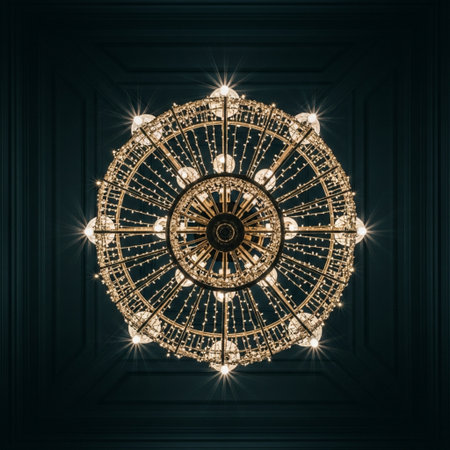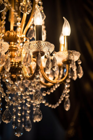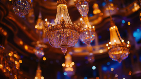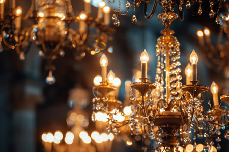 Glowing chandeliers illuminate a dimly-lit room, creating a moody and sophisticated ambiance, Glimmering chandeliers casting a soft glow