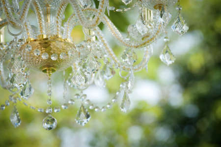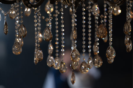 Close-up photo of vintage crystal chandelier in the restaurant.