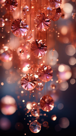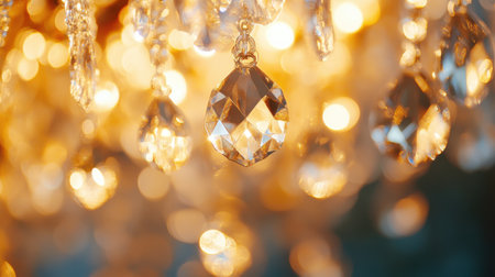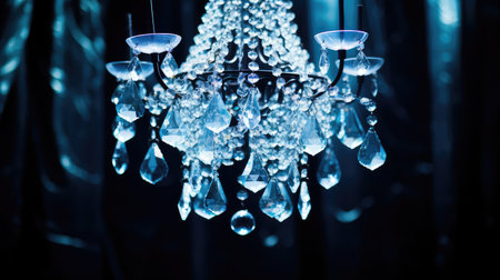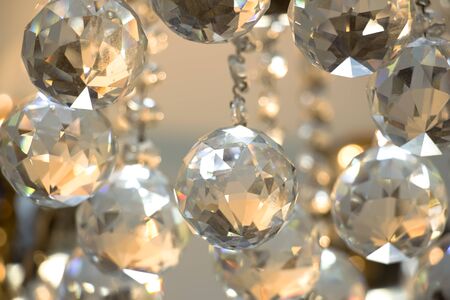 A cluster of crystal ornaments hanging from a light fixture. The light is shining on the ornaments, creating a sparkling effect. Concept of luxury and elegance
