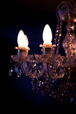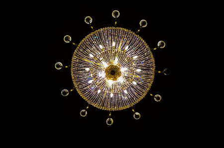 Cyrstal Chandelier shining on a dark background. light shinning through isolated chandelier on a black background.