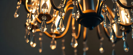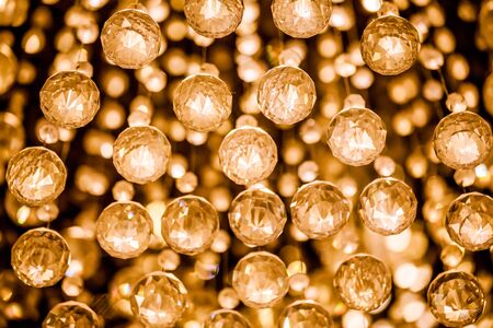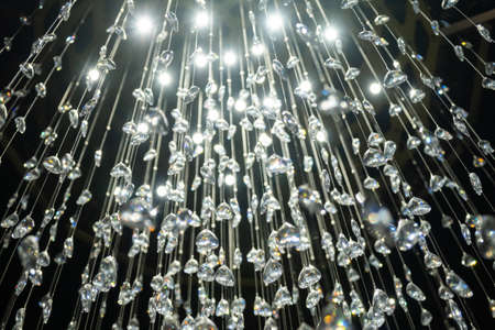 Crystal stones dangle and glisten on black background. Shining crystal chandelier.