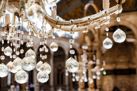 Vintage crystal chandelier hanging indoors, displaying intricate detailing and sparkling prisms. Blurred background with architectural elements