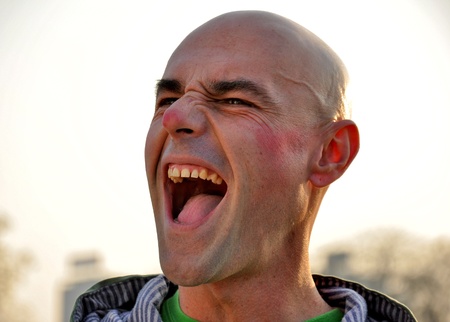 A bearded man wearing glasses and a camouflage hat is looking very surprised with his mouth wide open. He is standing in an urban environment with cars and buildings in the background.