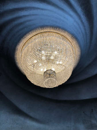 Beautiful crystal chandelier in luxury hotel interior. Selective focus.