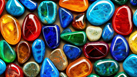 Collection of smooth and textured polished gemstones creating a vibrant, abstract background