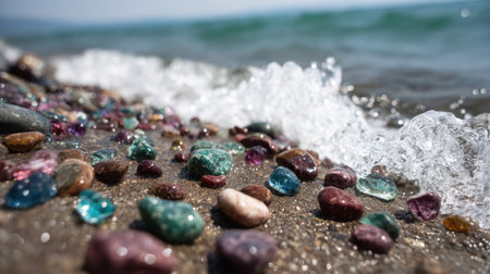 A captivating image of colorful gemstones scattered along a sandy beach, with gentle waves lapping the shore under a clear blue sky.