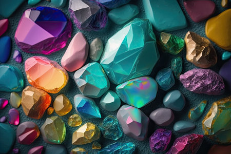 A pile of colorful stones and crystals. The stones are of different shapes and sizes, and they are arranged in a way that creates a visually appealing pattern. The colors of the stones are vibrant