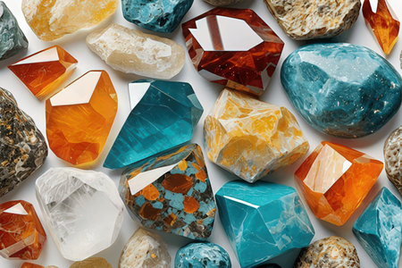 Collection of colorful raw gemstones arranged on white background. Variety of mineral stones in different shapes and colors. Geology, energy healing, and jewelry making