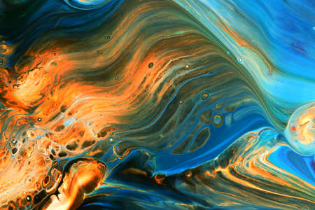 Abstract background of acrylic paints in orange and blue color tones