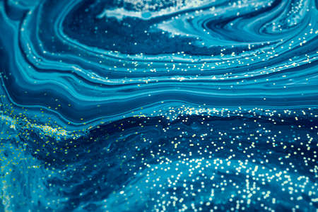 Marbled blue abstract background with golden sequins. Liquid marble ink pattern