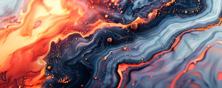 Ink wave. Marble texture. Paint water mix. Hot volcanic eruption. Blur red orange yellow color glitter fluid flow abstract background.