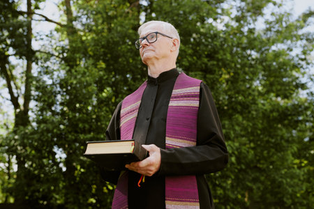 Low angle shot of old priest holding Bible outdoors