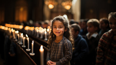 Cute little girl in a church with candles in the background.