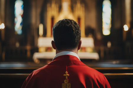 In a quiet church adorned with stained glass windows a priest wearing a striking red vestment sits in contemplation. The soft glow of candles enhances the serene atmosphere as he focuses on his spiritual connection