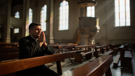 A priest kneels in prayer inside a tranquil church. Sunlight filters through stained glass, casting soft shadows on wooden benches. A peaceful atmosphere surrounds the sacred space