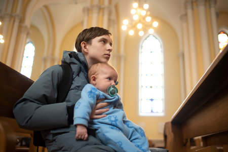 A 12-year-old boy sits with his baby brother on a bench in a Catholic church during a children's mass